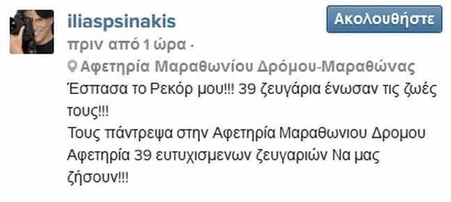 Με ανάρτησή του στο instagram, ο κ. Ψινάκης αποκάλυψε ότι έσπασε το ρεκόρ του, καθώς 39 ζευγάρια ενώθηκαν με τα δεσμά του γάμου στο Μαραθώνα.