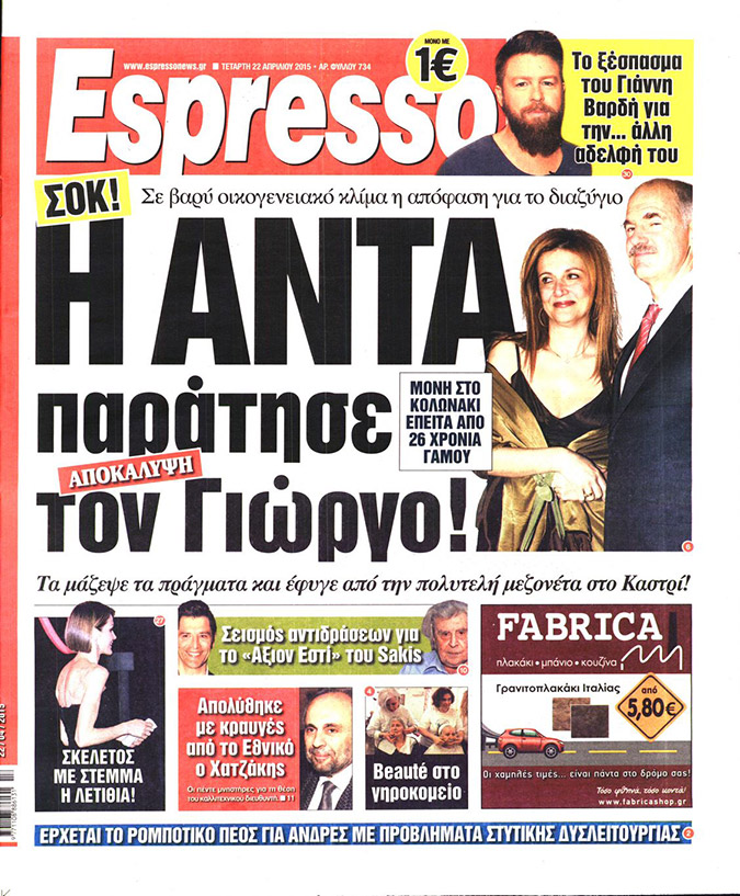 Σαστισμένοι οι πολίτες της Αθήνας στέκονται στα περίπτερα και κοιτάνε το πρωτοσέλιδο της Espresso που γράφει για το διαζύγιο Γιώργου και Άντας Παπανδρέου.