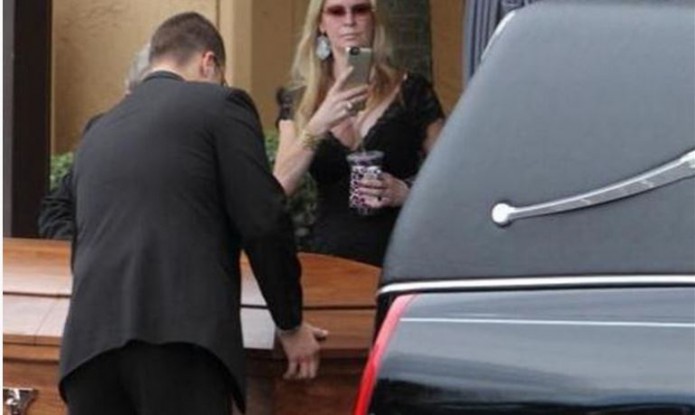Πιο συγκεκριμένα ο φωτογραφικός φακός έχει συλλάβει την τηλεπερσόνα να προσέρχεται στην κηδεία του παιδιού της φορώντας μία μπλούζα με αβυσσαλέο ντεκολτέ, κρατώντας ένα ποτό και φωτογραφίζοντας το φέρετρο! Σαν να μην έφτανε αυτό κάποιες από τις φωτογραφίες ήταν και selfie!
