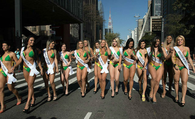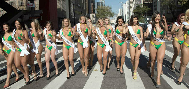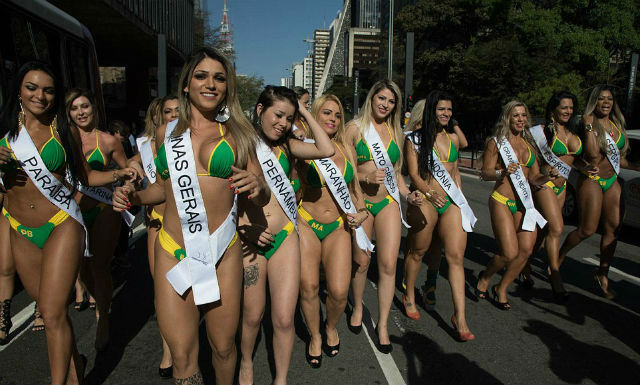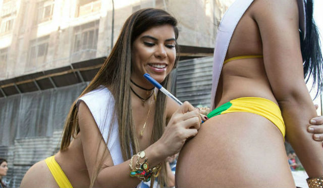 Τα μοντέλα φορώντας τα πρασινοκίτρινα μπικίνι τους και τα ψηλά τακούνια προωθούν τον τον γνωστό παγκοσίος διαγωνισμό για τα καλύτερα οπίσθια της Βραζιλίας.