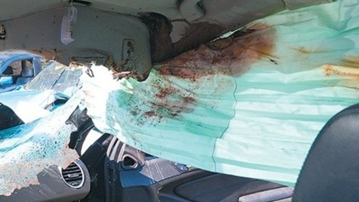 Στην φωτογραφία φαίνεται η κατεστραμμένη εμπρός δεξιά κολόνα του μεγάλου τζιπ, οι (πλευρικοί) αερόσακοι κεφαλής που ενεργοποιήθηκαν κατά τη σύγκρουση από την πλευρά του συνοδηγού, αλλά και τα ίχνη αίματος, τα οποία οι Αρχές απέδειξαν πως ανήκουν στον Παντελή Παντελίδη.