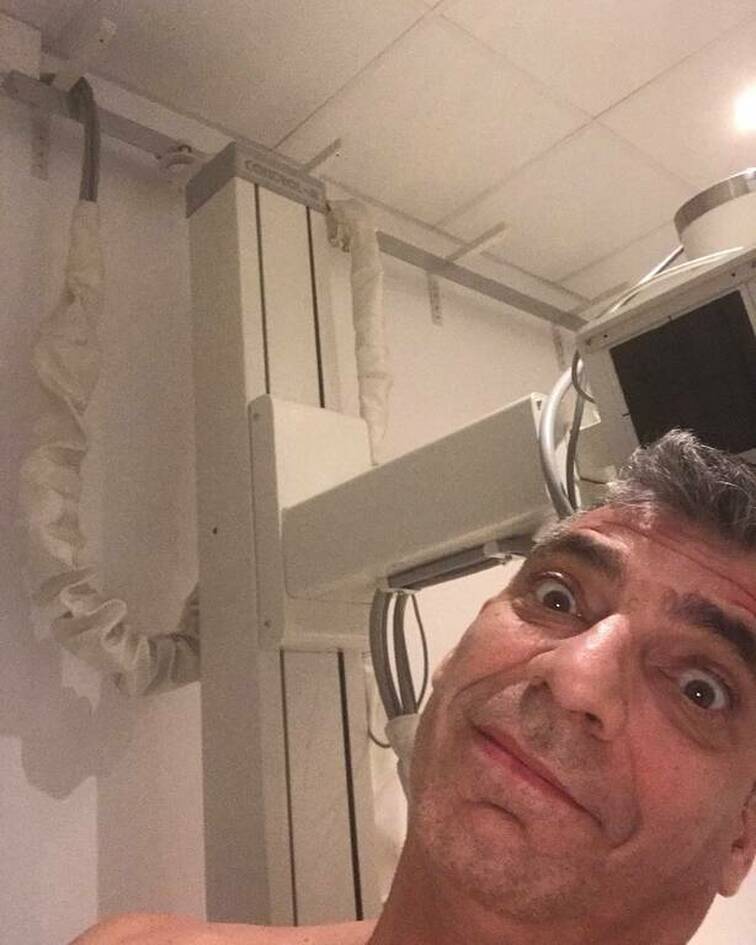 Ο ίδιος, με το γνωστό του χιούμορ, ακόμα και σε αυτή τη δύσκολη στιγμή του, θέλησε να διακωμωδήσει τις καταστάσεις και ανέβασε φωτογραφία του μέσα από το νοσοκομείο και μάλιστα την ώρα που πρόκειται να μπει για ακτινογραφία.