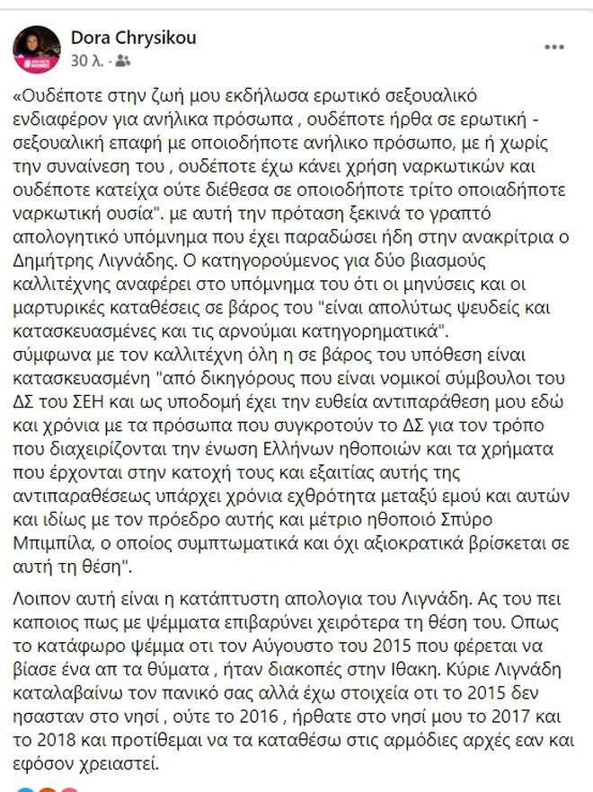 »Κύριε Λιγνάδη καταλαβαίνω τον πανικό σας αλλά έχω στοιχεία ότι το 2015 δεν ήσασταν στο νησί, ούτε το 2016, ήρθατε στο νησί μου το 2017 και το 2018 και προτίθεμαι να τα καταθέσω στις αρμόδιες Αρχές εάν και εφόσον χρειαστεί» έγραψε μεταξύ άλλων η Δώρα Χρυσικού.