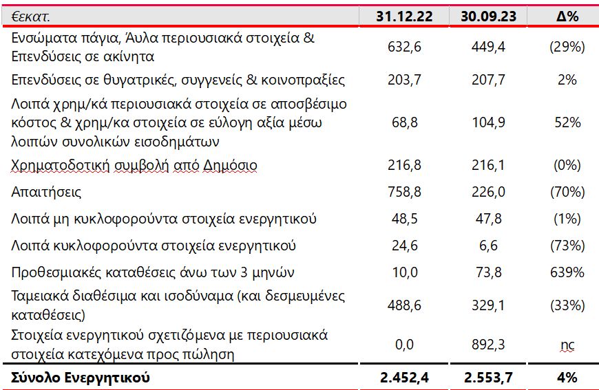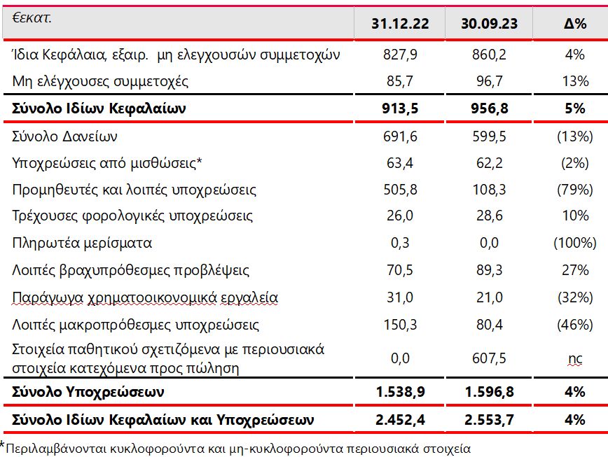 ♦ Τα ταμειακά διαθέσιμα και άμεσα ρευστοποιήσιμα στοιχεία ενεργητικού του Ομίλου (εξαιρουμένων των Κατεχόμενων προς πώληση) ανήλθαν σε €411 εκατ. στις 30.09.2023 έναντι €406 εκατ. στο τέλος του 2022.