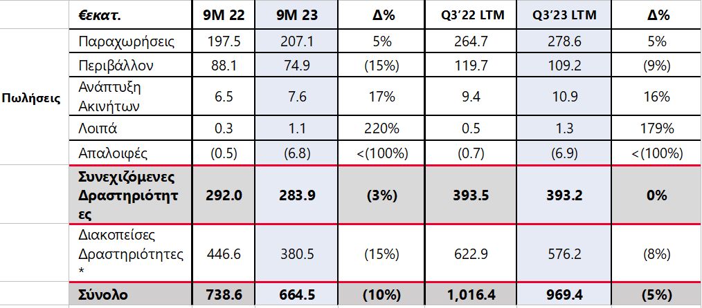 Η παρουσίαση των αποτελεσμάτων του Ομίλου ΕΛΛΑΚΤΩΡ για το 9M 2023, γίνεται διακριτά σε Συνεχιζόμενες Δραστηριότητες (Σ.Δ.) και Διακοπείσες Δραστηριότητες (Δ.Δ.)· οι τελευταίες περιλαμβάνουν την ΑΚΤΩΡ μέχρι 30/9/2023 και την δραστηριότητα των ανανεώσιμων πηγών ενέργειας μέχρι 31/12/2022.