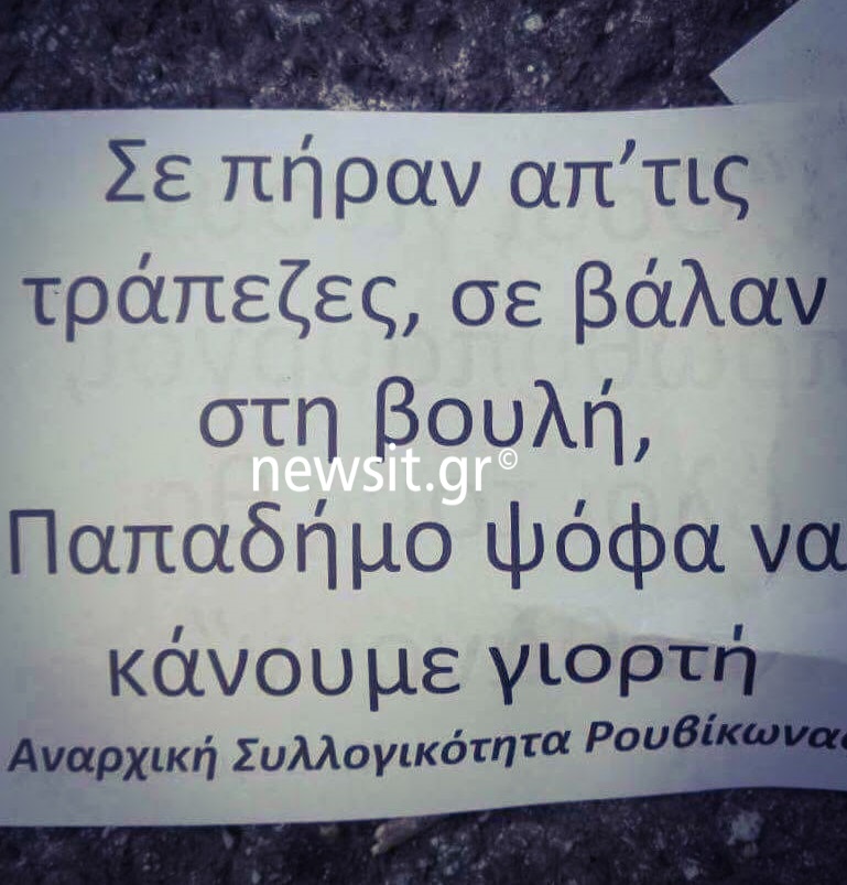 Η αναρχική ομάδα εξαπολύει ξεκάθαρες απειλές με τα τρικάκια που γράφουν “όσοι γίνουν πρωθυπουργοί, όλοι τους θα πεθάνουν” και “σε πήρν απ’ τις τράπεζες, σε βάλαν στη Βουλή, Παπαδήμο ψόφα να κάνουμε γιορτή”!