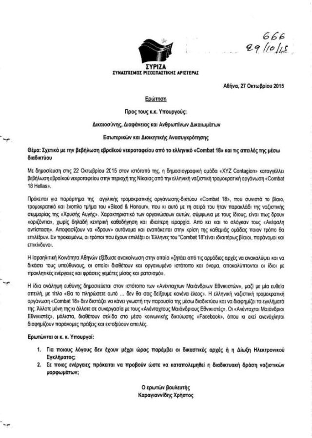 Για την τελευταία επίθεση αλλά και για «απειλές της μέσω διαδικτύου» είχε καταθέσει ερώτηση τον Οκτώβριο του 2015 στη Βουλή ο βουλευτής του ΣΥΡΙΖΑ, Χρήστος Καραγιαννίδης, ο οποίος ανέφερε ότι η «”Combat 18” συνιστά το βίαιο, τρομοκρατικό και ένοπλο τμήμα του “Blood & Honour”, που κι αυτό με τη σειρά του ήταν παρακλάδι της ναζιστικής συμμορίας της “Χρυσής Αυγής”».