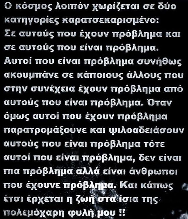 «Ο κόσμος λοιπόν χωρίζεται σε δυο κατηγορίες καρατσεκαρισμένο. Σε αυτούς που έχουν πρόβλημα και σε αυτούς που είναι πρόβλημα.