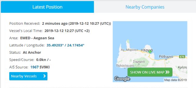 Σύμφωνα με τον ιστότοπο Marinetraffic, το ύποπτο πλοίο βρίσκεται αυτή τη στιγμή στη Σούδα.