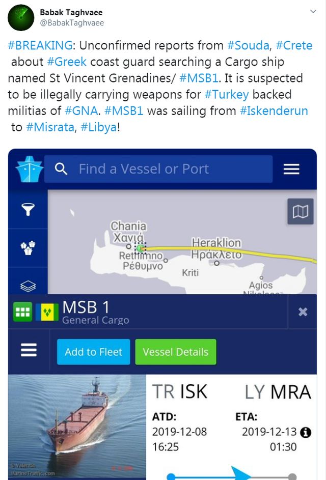 Ο συγγραφέας και αμυντικός αναλυτής, Babak Taghvaee, επίσης έγραψε στο Twitter ότι η ελληνική Ακτοφυλακή από τη βάση της Σούδας πραγματοποίησε έλεγχο σε ένα φορτηγό πλοίο που φέρει το όνομα St Vincent Grenadines.