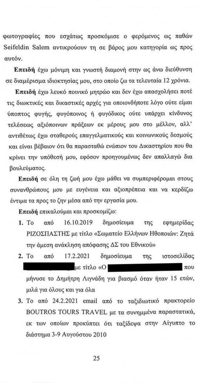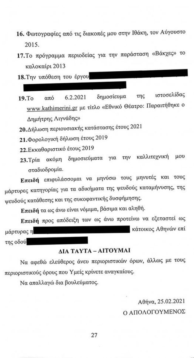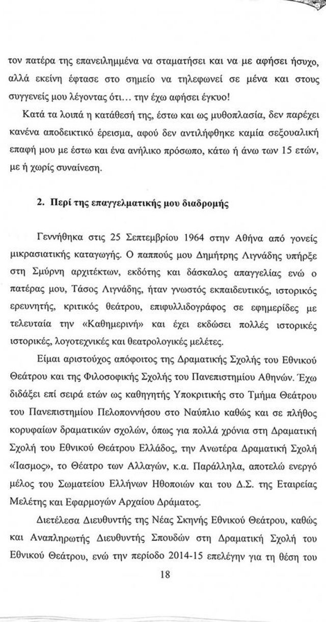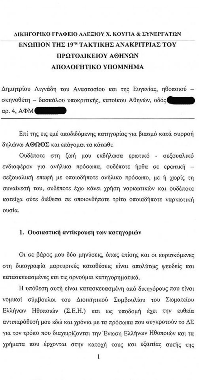 «Ουδέποτε στην ζωή μου εκδήλωσα ερωτικό σεξουαλικό ενδιαφέρον για ανήλικα πρόσωπα, ουδέποτε ήρθα σε ερωτική – σεξουαλική επαφή με οποιοδήποτε ανήλικο πρόσωπο, με ή χωρίς την συναίνεση του, ουδέποτε έχω κάνει χρήση ναρκωτικών και ουδέποτε κατείχα ούτε διέθεσα σε οποιοδήποτε τρίτο οποιαδήποτε ναρκωτική ουσία», με αυτή την πρόταση ξεκινά το γραπτό απολογητικό υπόμνημα που παρέδωσε στην ανακρίτρια ο Δημήτρης Λιγνάδης.