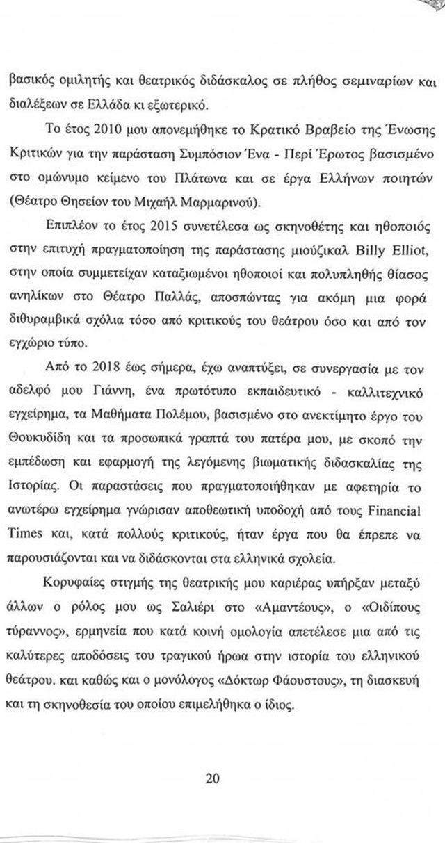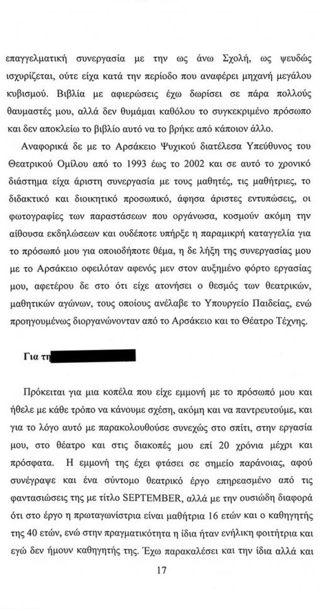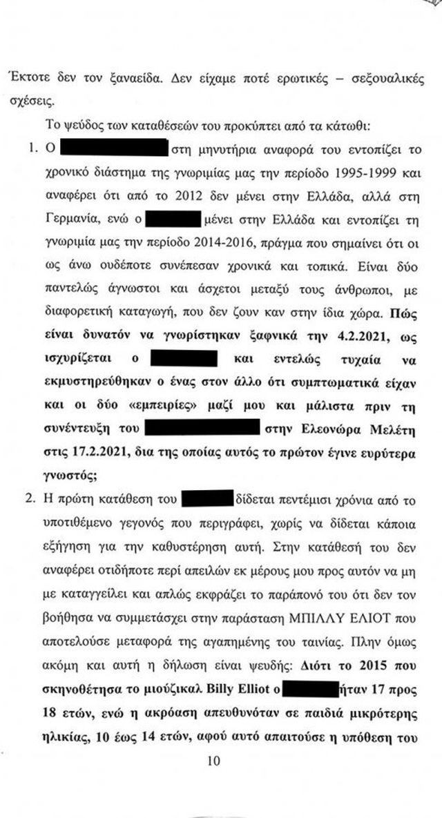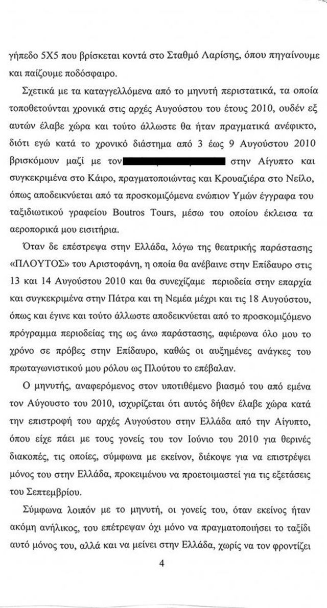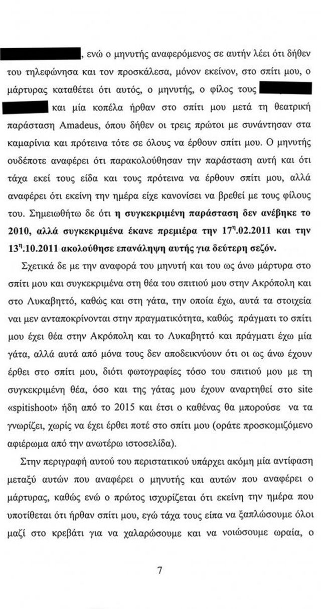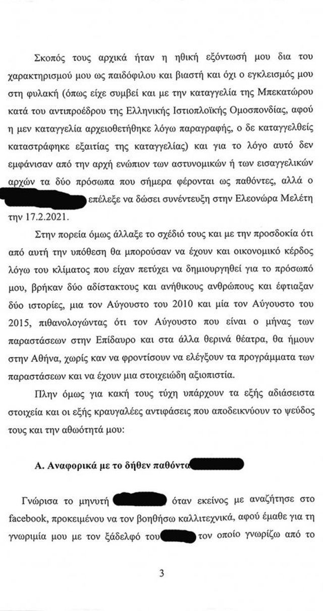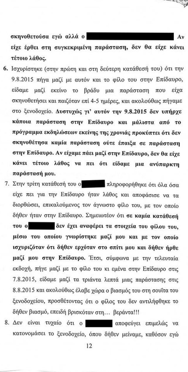 Σύμφωνα με το υπόμνημα «στην πορεία όμως, άλλαξε το σχέδιό τους και με την προσδοκία ότι από αυτή την υπόθεση θα μπορούσαν να έχουν και οικονομικό κέρδος λόγω του κλίματος που είχαν πετύχει να δημιουργηθεί για το πρόσωπο μου, βρήκαν δύο αδίστακτους και ανήθικους ανθρώπους και έφτιαξαν δύο ιστορίες, μια τον Αύγουστο του 2010 και μία τον Αύγουστο του 2015, πιθανολογώντας ότι τον Αύγουστο που είναι ο μήνας των παραστάσεων στην Επίδαυρο και στα άλλα θερινά θέατρα, θα ήμουν στην Αθήνα, χωρίς καν να φροντίσουν να ελέγξουν τα προγράμματα των παραστάσεων και να έχουν μια στοιχειώδη αξιοπιστία».