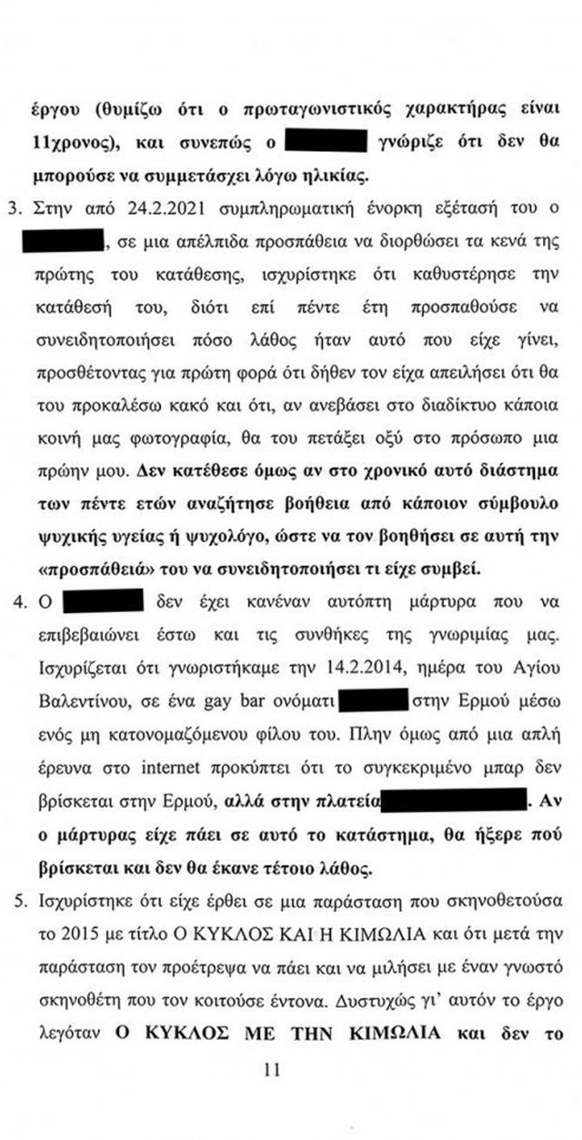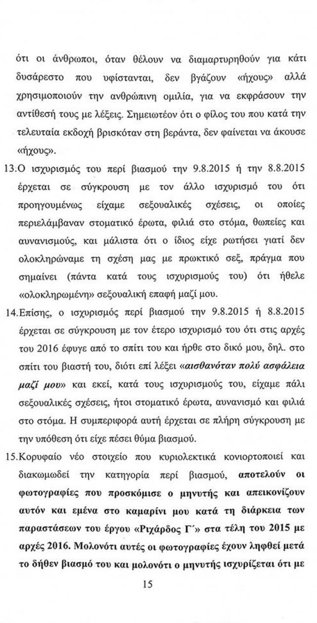 Ο κατηγορούμενος για δύο βιασμούς καλλιτέχνης αναφέρει στο υπόμνημα του ότι οι μηνύσεις και οι μαρτυρικές καταθέσεις σε βάρος του «είναι απολύτως ψευδείς και κατασκευασμένες και τις αρνούμαι κατηγορηματικά».