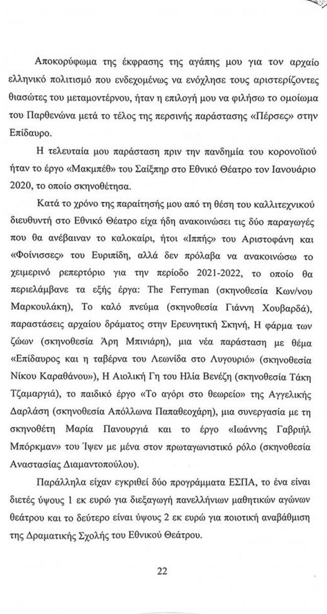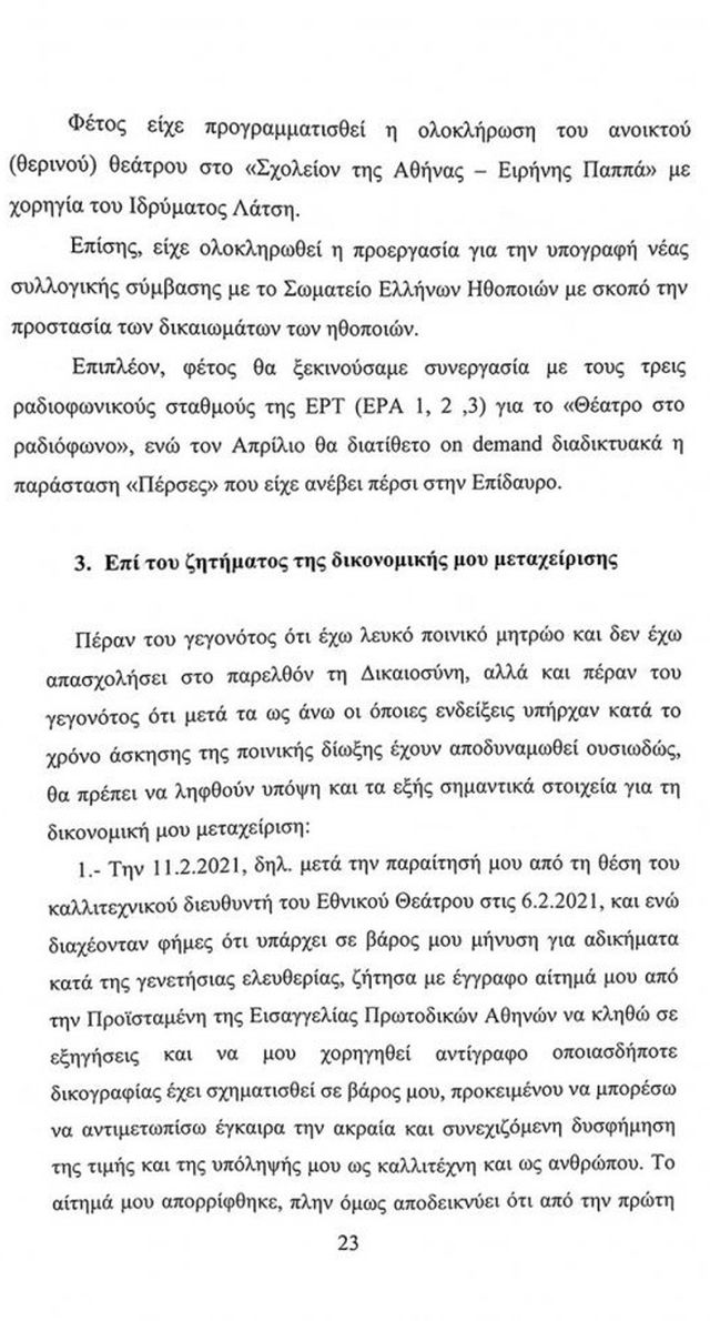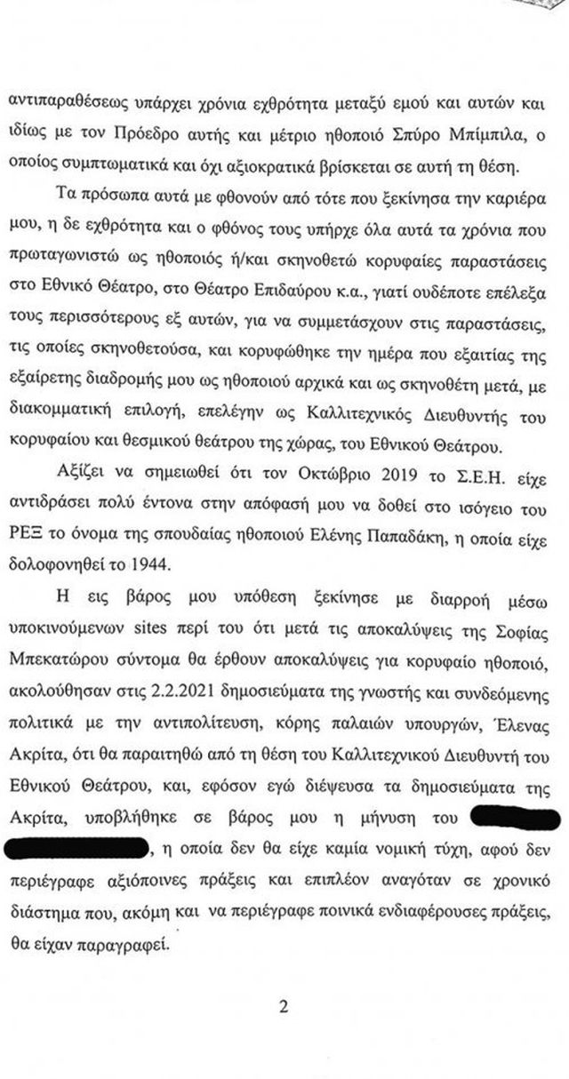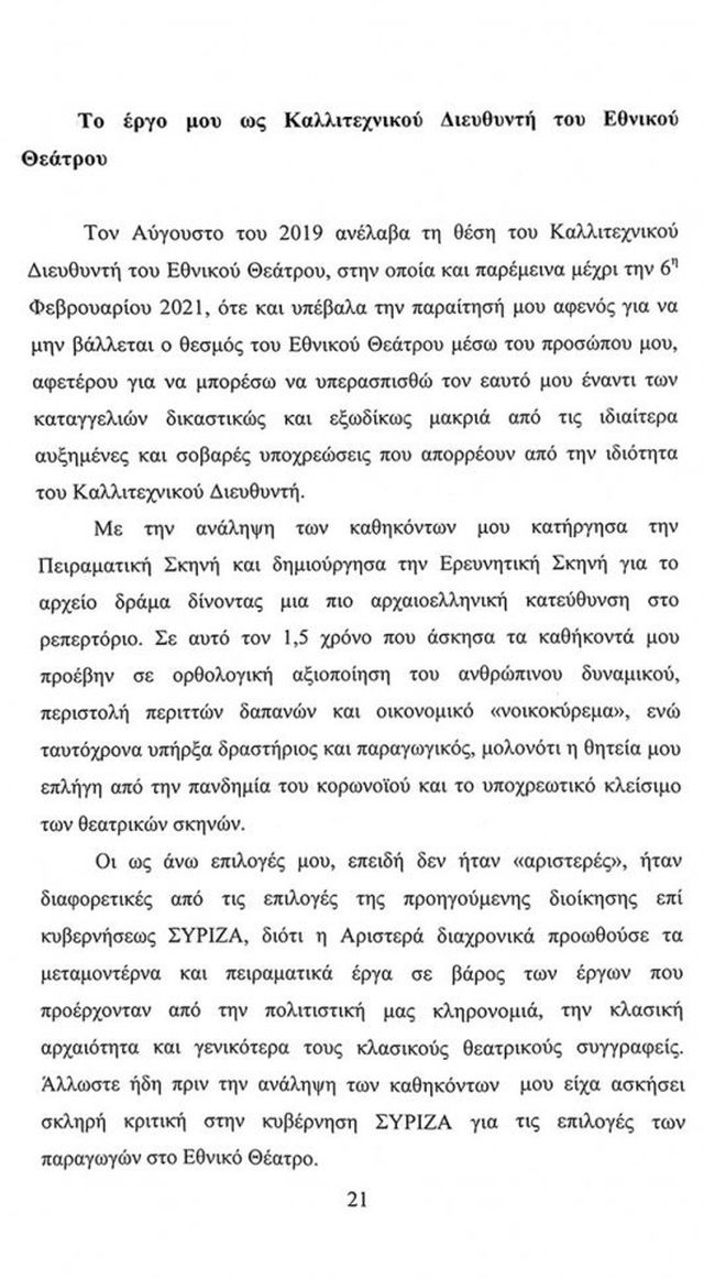 Ο πρώην καλλιτεχνικός διευθυντής του εθνικού θεάτρου κάνει λόγο για κατασκευασμένες κατηγορίες που έχουν τη βάση τους στην χρόνια αντιπαράθεσή του με το διοικητικό συμβούλιο του ΣΕΗ, αλλά και την εχθρότητα που έχει με τον πρόεδρό του, Σπύρο Μπιμπίλα.