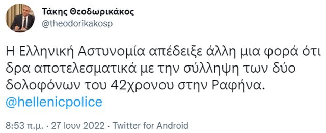 «Η Ελληνική Αστυνομία απέδειξε άλλη μια φορά ότι δρα αποτελεσματικά με την σύλληψη των δύο δολοφόνων του 42χρονου στην Ραφήνα».
