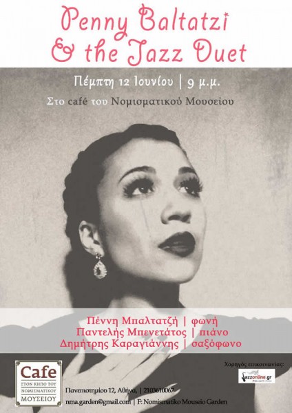 Στο Νομισματικό Μουσείο, πιο συγκεκριμένα στον όμορφο κήπο του, την Πέμπτη 12 Ιουνίου στις 9 μ.μ., θα εμφανιστεί για μια μοναδική βραδιά η Πέννυ Μπαλτατζή (από τους Penny & The Swingin’ Cats) μαζί με τον Παντελή Μπενετάτο στο πιάνο και τον Δημήτρη Καραγιάννη στο σαξόφωνο.