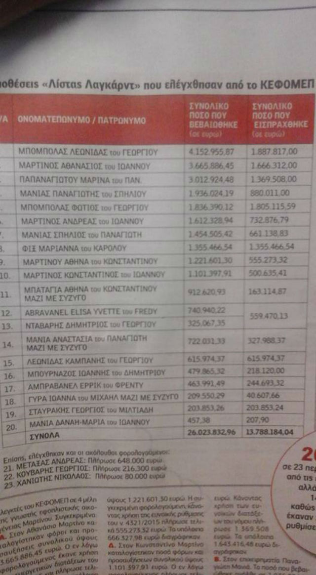 Σύμφωνα με τα στοιχεία που έχει στη διάθεσή της και παρουσιάζει σήμερα η «F&M Voice», το Κέντρο Ελέγχου Φορολογουμένων Μεγάλου Πλούτου (ΚΕΦΟΜΕΠ) και οι άλλες αρμόδιες φοροελεγκτικές υπηρεσίες που έχουν επιληφθεί των ελέγχων στα φυσικά και νομικά πρόσωπα της «Λίστας Λαγκάρντ», βεβαίωσαν, μέχρι στιγμής, φόρους, πρόστιμα και προσαυξήσεις συνολικού ύψους άνω των 26 εκατ. ευρώ σε 23 περιπτώσεις.