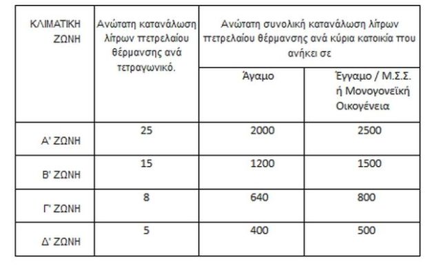 3. Για κάθε κατοικία, ανεξαρτήτως ζώνης, χορηγείται επίδομα σε άγαμους για τα πρώτα 80 τετραγωνικά μέτρα και για τα πρώτα 100 μέτρα για τους έγγαμους και τις μονογονεϊκές οικογένειες, με ανώτατη κατανάλωση πετρελαίου θέρμανσης ανά κλιματική ζώνη και ανά τετραγωνικό ως ακολούθως: