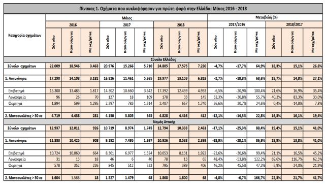 Σύμφωνα επίσης με την ΕΛΣΤΑΤ, τον Μάιο κυκλοφόρησαν 4.828 νέες μοτοσικλέτες κυβισμού άνω των 50 cc (καινούργιες ή μεταχειρισμένες εξωτερικού) έναντι 4.150 τον αντίστοιχο μήνα του 2017, παρουσιάζοντας αύξηση 16,3% (μείωση 12,1% είχε παρουσιαστεί τον Μάιο 2017 σε σχέση με τον αντίστοιχο μήνα του 2016).
