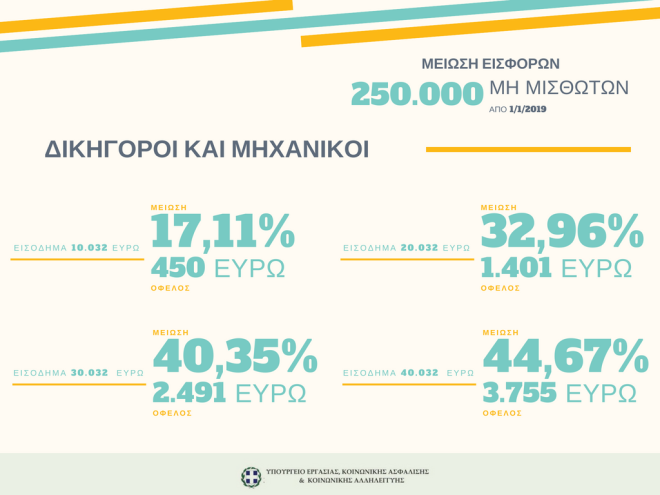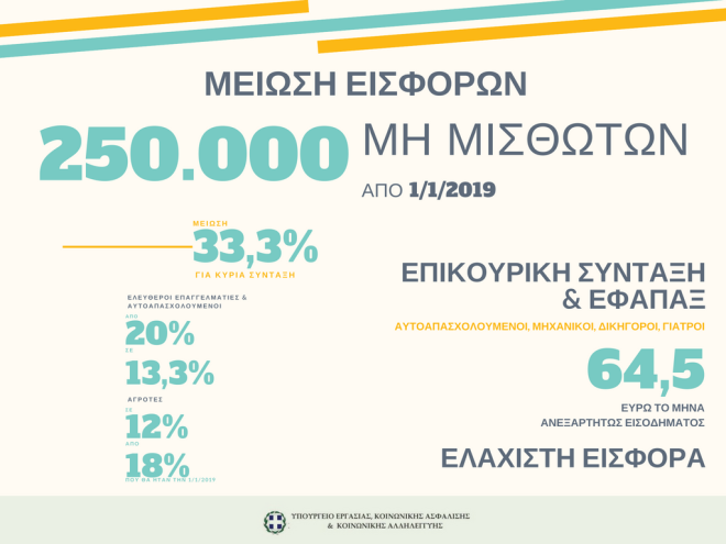 «Δηλαδή περίπου 1.250.000 μη μισθωτοί ήδη πληρώνουν λιγότερα και άλλοι 250.000 έχουν τις σημαντικές ελαφρύνσεις που προανέφερα. Ουσιαστικά, λοιπόν, το σύνολο των μη μισθωτών (περίπου 1,5 εκατ.) ευνοείται με το νέο ασφαλιστικό και τις πρόσθετες ελαφρύνσεις του 2019».