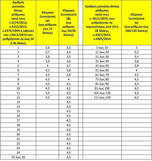 Οι συντελεστές του πίνακα εφαρμόζονται και για τις ενεργές ρυθμίσεις που έχουν χορηγηθεί πριν από τη δημοσίευση του ν.4611/2019, με τη χρήση του συντελεστή που αντιστοιχεί, κατά περίπτωση, στον αριθμό της τελευταίας μηνιαίας δόσης ρύθμισης που εξοφλήθηκε.