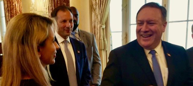 Ο Αμερικανός Υπουργός Εξωτερικών Μάικ Πομπέο και ο Αμερικανός Υφυπουργός Εξωτερικών Φράνσις Φάννον με την Πέγκυ Λιβανίου σε δεξίωση στο State Department στην Ουάσιγκτον της Αμερικής