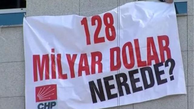 Συγκεκριμένα, τρεις βουλευτές της αξιωματικής αντιπολίτευσης, ο Αλί Μαχίρ Μπασαρίρ, η Σερά Καντιγκίλ και ο Μαχμού Τανάλ ξεδίπλωσαν στα μέσα του περασμένου Μαΐου ένα τεράστιο πανό 450 τ.μ. από την Πρώτη Γέφυρα του Βοσπόρου, όπου αναγραφόταν το γνωστό σύνθημα για τα χαμένα 128 δισ. δολάρια που φέρεται να λείπουν από τα ταμεία της Κεντρικής Τράπεζας της Τουρκίας.
