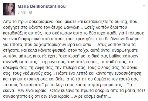 Από το πρωί σοκαρισμένοι όλοι μιλάτε και καταδικάζετε το bulling, που οδήγησε στο θάνατο τον άτυχο Βαγγέλη… Εσείς λοιπόν όλοι που καταδικάζετε αυτούς που σκότωσαν αυτό το δύστυχο παιδί, γιατί τόλμησε να είναι διαφορετικό από αυτούς τους τρέντηδες που δε δίνουνε δεκάρα για τίποτα, που δε χαμπαριάζουν ιερά και όσια…. εσείς λοιπόν που τα στήσατε, και καλά κάνατε φυσικά, στον τοίχο, αυτά όντα, αναρωτηθείτε λοιπόν, μήπως κι εσείς έχετε “σκοτώσει” με το δικό σας bulling κάποιον συνάνθρωπό σας… τη μάνα σας, τον πατέρα σας, τα παιδιά σας, τα αδέρφια σας, τη νύφη σας, την πεθερά σας, τους φίλους σας, τα σόγια σας, τους γκόμενούς σας… Πάρτε ένα λεπτό και κάντε την ενδοσκόπηση και την αυτοκριτική σας και δείτε, από τότε που θυμάστε τον εαυτό σας, πόσους “σκοτώσατε” με τα λόγια σας και τη συμπεριφορά σας… Το έκανα.. Δεν είναι ωραίο.. Όταν κυλάνε τα πρώτα δάκρυα από τα μάτια, τότε συνειδητοποιείς ότι δεν είναι ωραίο… Α ρε κόσμε αλήτη…