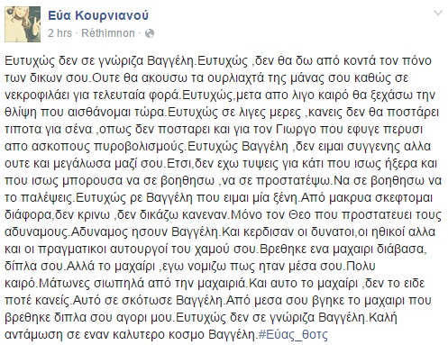 Ευτυχώς δεν σε γνώριζα Βαγγέλη.Ευτυχώς ,δεν θα δω από κοντά τον πόνο των δικων σου.Ουτε θα ακουσω τα ουρλιαχτά της μάνας σου καθώς σε νεκροφιλάει για τελευταία φορά.Ευτυχώς,μετα απο λιγο καιρό θα ξεχάσω την θλίψη που αισθάνομαι τώρα.Ευτυχώς σε λιγες μερες ,κανεις δεν θα ποστάρει τιποτα για σένα ,οπως δεν ποσταρει και για τον Γιωργο που εφυγε περυσι απο ασκοπους πυροβολισμούς.Ευτυχώς Βαγγέλη ,δεν ειμαι συγγενης αλλα ουτε και μεγάλωσα μαζί σου.Ετσι,δεν εχω τυψεις για κάτι που ισως ήξερα και που ισως μπορουσα να σε βοηθησω ,να σε προστατέψω.Να σε βοηθησω να το παλέψεις.Ευτυχώς ρε Βαγγέλη που ειμαι μία ξένη.Από μακρυα σκεφτομαι διάφορα,δεν κρινω ,δεν δικάζω κανεναν.Μόνο τον Θεο που προστατευει τους αδυναμους.Αδυναμος ησουν Βαγγέλη.Και κερδισαν οι δυνατοι,οι ηθικοί αλλα και οι πραγματικοι αυτουργοί του χαμού σου.Βρεθηκε ενα μαχαιρι διάβασα, δίπλα σου.Αλλά το μαχαίρι ,εγω νομιζω πως ηταν μέσα σου.Πολυ καιρό.Μάτωνες σιωπηλά από την μαχαιριά.Και αυτο το μαχαίρι ,δεν το ειδε ποτέ κανείς.Αυτό σε σκότωσε Βαγγέλη.Από μεσα σου βγηκε το μαχαιρι που βρεθηκε διπλα σου αγορι μου.Ευτυχώς δεν σε γνώριζα Βαγγέλη.Καλή αντάμωση σε εναν καλυτερο κοσμο Βαγγέλη