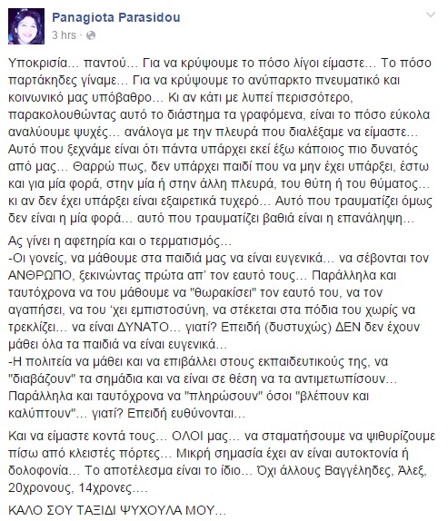Και να είμαστε κοντά τους… ΟΛΟΙ μας… να σταματήσουμε να ψιθυρίζουμε πίσω από κλειστές πόρτες… Μικρή σημασία έχει αν είναι αυτοκτονία ή δολοφονία… Το αποτέλεσμα είναι το ίδιο… Όχι άλλους Βαγγέληδες, Άλεξ, 20χρονους, 14χρονες….