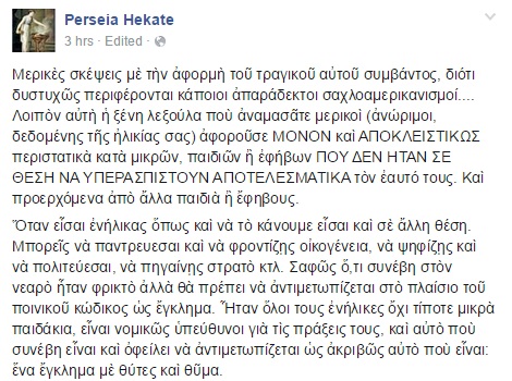 Ὅταν εἶσαι ἐνήλικας ὅπως καὶ νὰ τὸ κάνουμε εἶσαι καὶ σὲ ἄλλη θέση. Μπορεῖς νὰ παντρευεσαι καὶ νὰ φροντίζῃς οἰκογένεια, νὰ ψηφίζῃς καὶ νὰ πολιτεύεσαι, νὰ πηγαίνῃς στρατὸ κτλ. Σαφῶς ὅ,τι συνέβη στὸν νεαρὸ ἦταν φρικτὸ ἀλλὰ θὰ πρέπει νὰ ἀντιμετωπίζεται στὸ πλαίσιο τοῦ ποινικοῦ κώδικος ὡς ἔγκλημα. Ἦταν ὅλοι τους ἐνήλικες ὄχι τίποτε μικρὰ παιδάκια, εἶναι νομικῶς ὑπεύθυνοι γιὰ τὶς πράξεις τους, καὶ αὐτὸ ποὺ συνέβη εἶναι καὶ ὀφείλει νὰ ἀντιμετωπίζεται ὡς ἀκριβῶς αὐτὸ ποὺ εἶναι: ἕνα ἔγκλημα μὲ θύτες καὶ θῦμα.