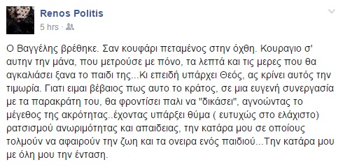 Ο Βαγγέλης βρέθηκε. Σαν κουφάρι πεταμένος στην όχθη. Κουραγιο σ’ αυτην την μάνα, που μετρούσε με πόνο, τα λεπτά και τις μερες που θα αγκαλιάσει ξανα το παιδι της…Κι επειδή υπάρχει Θεός, ας κρίνει αυτός την τιμωρία. Γιατι ειμαι βέβαιος πως αυτο το κράτος, σε μια ευγενή συνεργασία με τα παρακράτη του, θα φροντίσει παλι να “δικάσει”, αγνοώντας το μέγεθος της ακρότητας..έχοντας υπάρξει θύμα ( ευτυχώς στο ελάχιστο) ρατσισμού ανωριμότητας και απαιδειας, την κατάρα μου σε οποίους τολμούν να αφαιρούν την ζωη και τα ονειρα ενός παιδιού…Την κατάρα μου με όλη μου την ένταση.