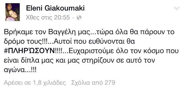 «Βρήκαμε τον Βαγγέλη μας…τώρα όλα θα πάρουν το δρόμο τους», γράφει.