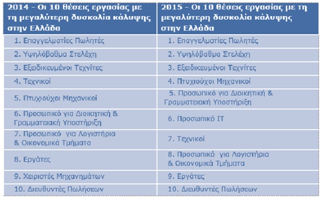 Top-10 των θέσεων εργασίας με τη μεγαλύτερη δυσκολία κάλυψης για την Ελλάδα 2014-2015