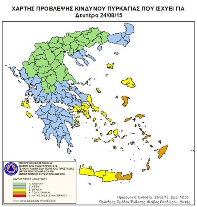 Συγκεκριμένα, με βάση τον Χάρτη Πρόβλεψης Κινδύνου Πυρκαγιάς που εκδίδει, στην κατηγορία κινδύνου 4 εντάσσονται αύριο Χίος, Σάμος, Ικαρία, Δωδεκάνησα και Λασίθι.