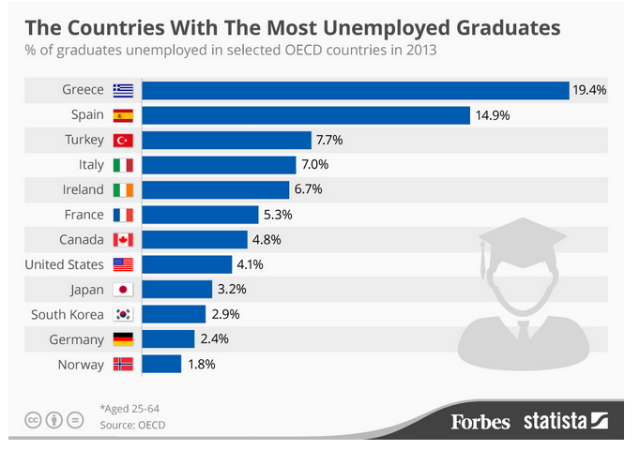 Στην κορυφή λίστας του ΟΟΣΑ με τις χώρες που έχουν τους περισσότερους άνεργους πτυχιούχους βρίσκεται η Ελλάδα, αναφέρει σε άρθρο του το γνωστό αμερικανικό περιοδικό Forbes, απονέμοντας έτσι ακόμα μια αρνητική πρωτιά στη χώρα μας.