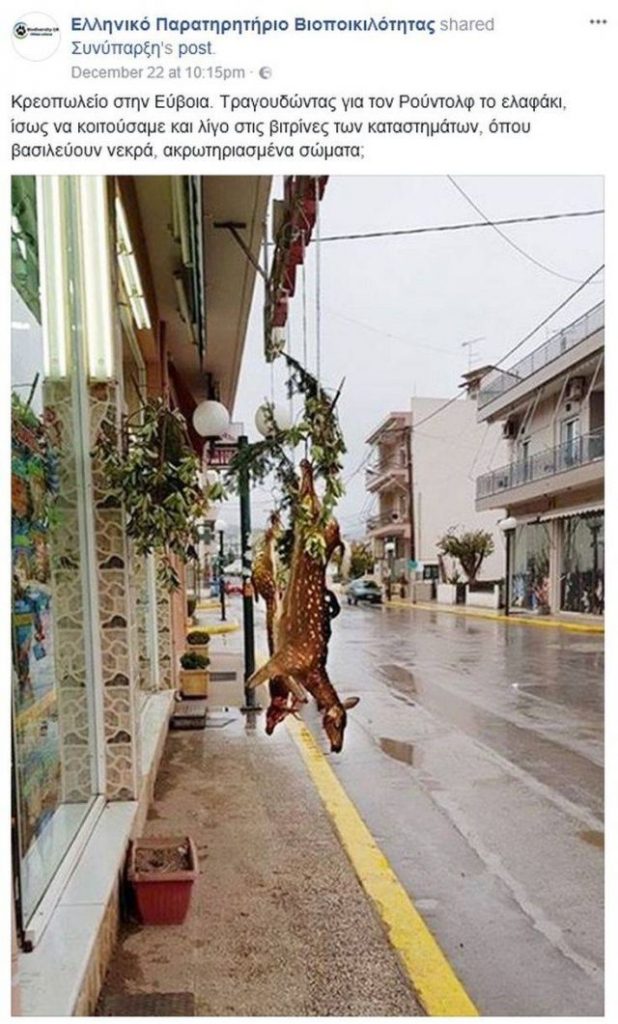 Το γύρο του διαδικτύου κάνει η φωτογραφία με δύο σκοτωμένα ελάφια, που ήταν κρεμασμένα σε τσιγκέλια έξω από κρεοπωλείο στα Ψαχνά Ευβοίας.