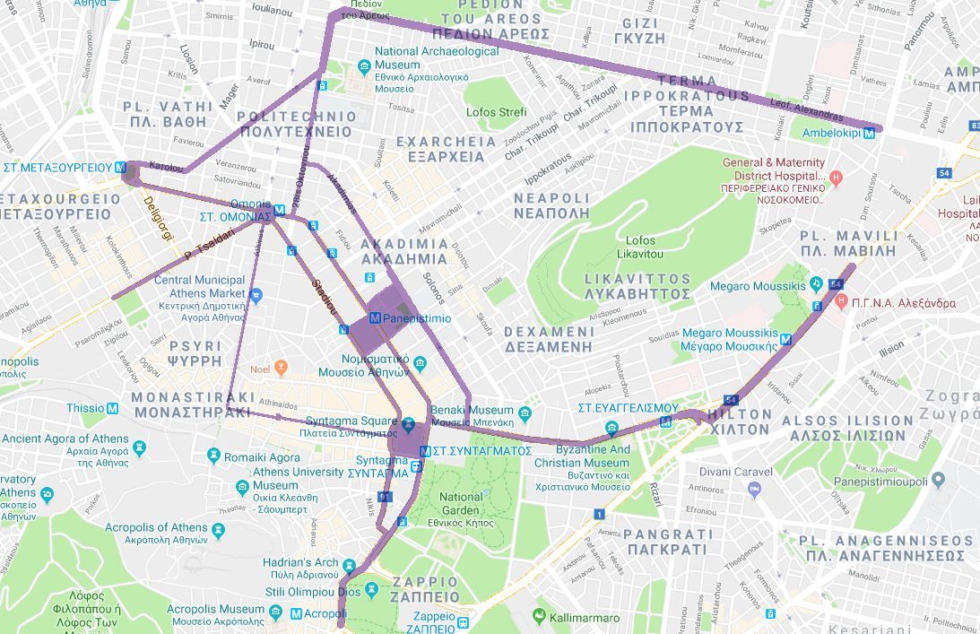 Πράγματι, τότε η πλατεία Συντάγματος των μόλις 14.454 τετραγωνικών θα είναι αρκετά μικρή, κι έτσι – όπως φαίνεται και στο διάγραμμα – αναμένουμε με αγωνία να δούμε τις εξής πλατείες και δρόμους τελείως γεμάτους: Αμαλίας (25.284 τ.μ.), Ομόνοια – Πανεπιστημίου – Σταδίου – Β. Σοφίας έως την αμερικάνικη πρεσβεία (112.324 τ.μ.), Προπύλαια και Πλατεία Κοραή (34.409 τ.μ.), Πατησίων από Ομόνοια έως Αλεξάνδρας (16.242 τ.μ.), Αλεξάνδρας από Πεδίον του Αρεως ως Αμπελόκηπους (59.220 τ.μ.), Πειραιώς από την Ομόνοια έως την Κουμουνδούρου (9.822 τ.μ.), Φιλελλήνων (6.039 τ.μ.), Ερμού (4.994 τ.μ.), Μεταξουργείο – Αγ. Κωνσταντίνου (15.080 τ.μ.), Μάρνη (10.650 τ.μ.), Ακαδημίας (19.565 τ.μ.).