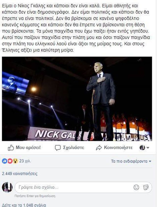 Στην ανάρτησή του ο Νίκος Γκάλης προσθέτει ότι τα μόνα παιχνίδια που έχει παίξει είναι εντός γηπέδου και χαρακτηρίζει όσους παίζουν παιχνίδια στην πλάτη του και την πλάτη του ελληνικού λαού, άξιους της μοίρας τους.