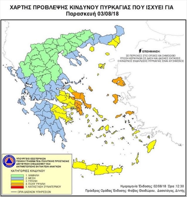Για πολύ υψηλό κίνδυνο πυρκαγιάς (κατηγορία κινδύνου 4) την Παρασκευή 3 Αυγούστου, προειδοποιεί, με βάση τον Χάρτη Πρόβλεψης Κινδύνου Πυρκαγιάς που εκδίδει, η Γενική Γραμματεία Πολιτικής Προστασίας του υπουργείου Εσωτερικών.(www.civilprotection.gr).