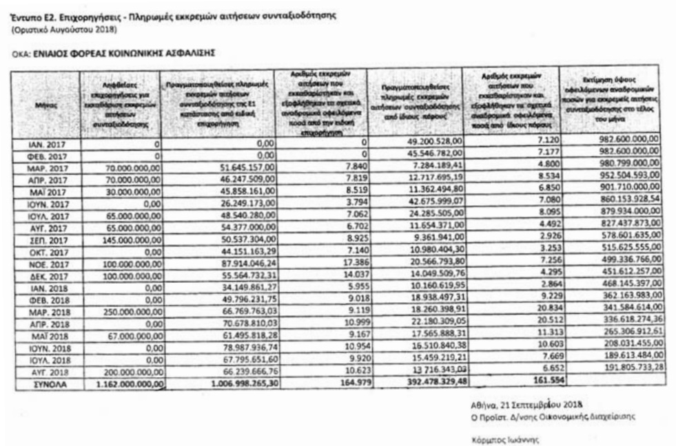 Όσον αφορά στη ροή των συντάξεων που έχουν καταβληθεί την τελευταία διετία (από 1.1.2017 έως 31.8.2018) σύμφωνα με έγγραφο του Ενιαίου Φορέα Κοινωνικής Ασφάλισης που δημοσιεύει η Αυγή, επιβεβαιώνεται ότι μέχρι τον Αύγουστο έχουν καταβληθεί συνολικά 210.000 κύριες συντάξεις.