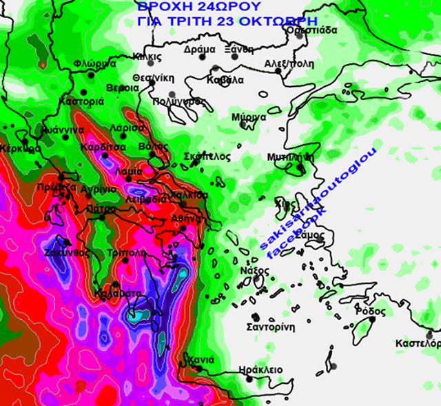 Όπως αναφέρει ο Σάκης Αρναούτογλου στη σελίδα του για τον καιρό στο facebook: «Την Τρίτη δείχνουν οι βροχές να είναι κατά τόπους ισχυρές σε αρκετές περιοχές της δυτικής και ηπειρωτικής Ελλάδας (συμπεριλαμβανομένης και της Αττικής) και σε περιοχές της νοτιοδυτικής Κρήτης!