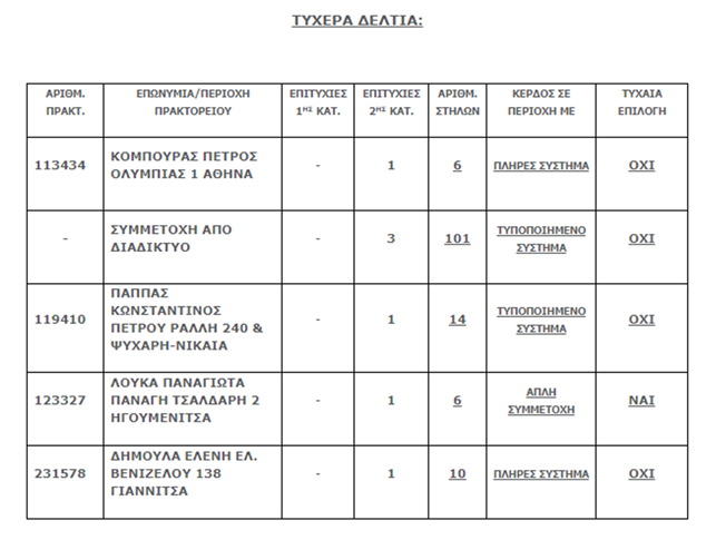 Tα υπόλοιπα τέσσερα δελτία συμπληρώθηκαν σε πρακτορεία σε Αθήνα, Ηγουμενίτσα και Γιαννιτσά.