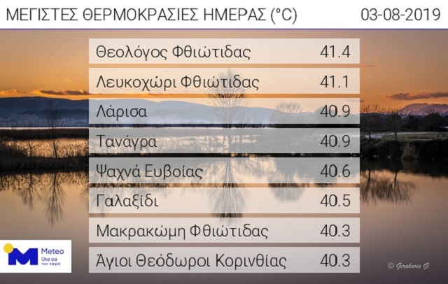 Συγκεκριμένα, στον Θεολόγο Φθιώτιδας η θερμοκρασία έφτασε στους 41,4 βαθμούς, ενώ στο Λευκοχώρι Φθιώτιδας άγγιξε τους 41,1.