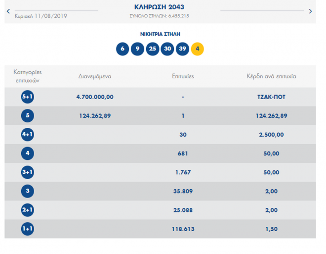 Οι τυχεροί αριθμοί που έβγαλε η κληρωτίδα της κλήρωσης της Κυριακή (11/08) είναι οι: 6, 9, 25, 30, 39 και Τζόκερ ο αριθμός 4.
