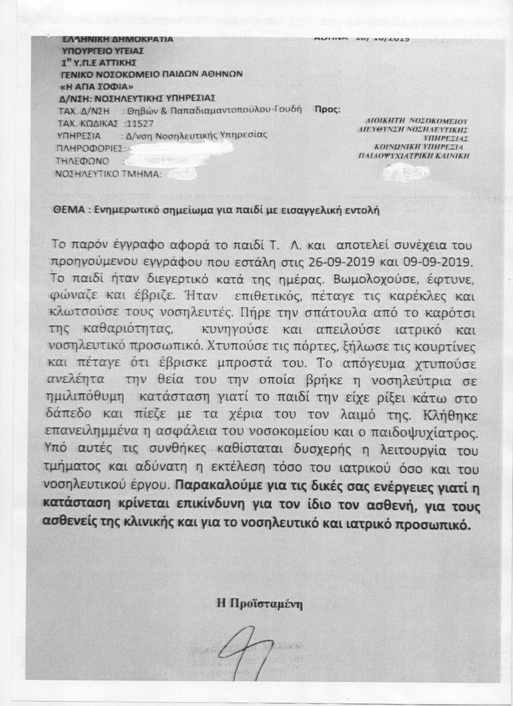 Όπως αναφέρεται στο σχετικό έγγραφο, το παιδί επιτέθηκε σε μέλη του νοσηλευτικού προσωπικού και χτύπησε ανελέητα τη θεία του που το επισκέφθηκε τις απογευματινές ώρες και πίεζε με τα χέρια του τον λαιμό της.