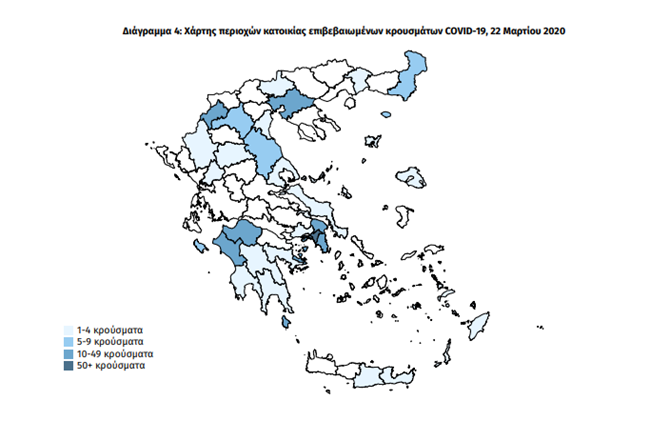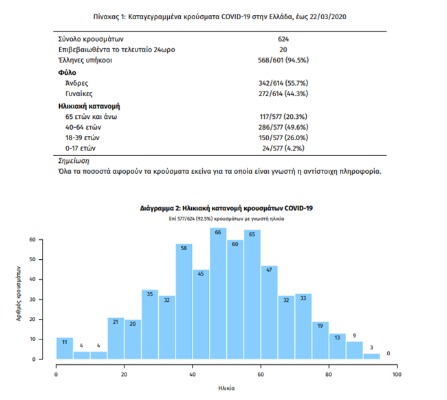 Στη νέα έκθεση παρουσιάζονται τα ευρήματα από την επιδημιολογική επιτήρηση της νόσου από το νέο κορονοϊό (COVID-19) στην Ελλάδα, με βάση τα στοιχεία που δηλώθηκαν στον ΕΟΔΥ μέχρι τις 22 Μαρτίου 2020 και ώρα 15:00.
