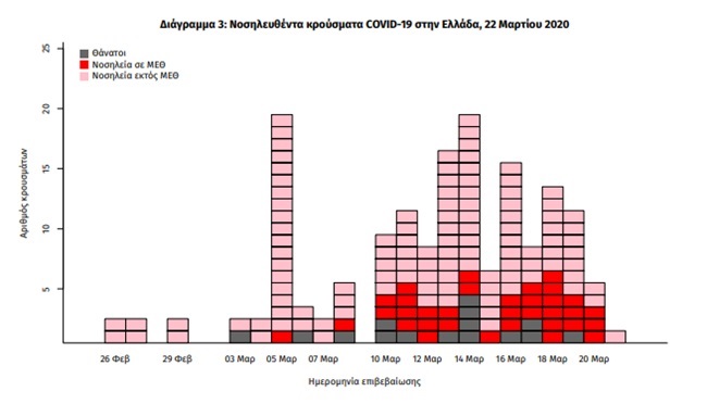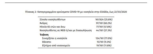 Σε ότι αφορά τα κρούσματα COVID-19 με νοσηλεία: Έχουν καταγραφεί 161 (25.8%) κρούσματα με νοσηλεία σε νοσοκομείο, εκ των οποίων 44 (27.3%) διασωληνώθηκαν, και 15 (9.3%) έχουν καταλήξει. Σύμφωνα με τα στοιχεία που έχουν δηλωθεί στον ΕΟΔΥ, στις 22 Μαρτίου 2020 συνεχίζουν να νοσηλεύονται 124 ασθενείς, εκ των οποίων 34 (27.4%) έχουν διασωληνωθεί.