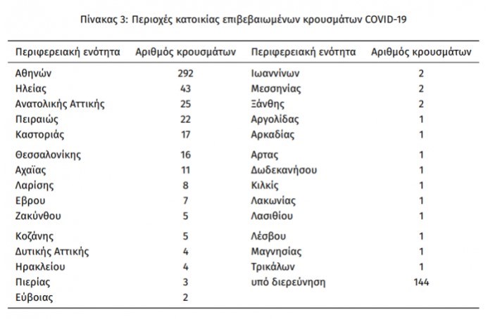 Σε τουλάχιστον 28 από τις 74 περιφερειακές ενότητες της χώρας έχουν καταγραφεί επιβεβαιωμένα κρούσματα κορονοϊού σύμφωνα με την τελευταία ενημέρωση από τον ΕΟΔΥ.