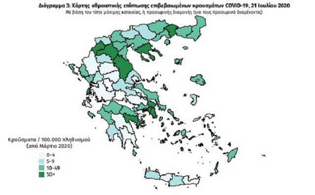 Ο χάρτης αποτυπώνει τη γεωγραφική κατανομή των συνολικών κρουσμάτων COVID-19 (από την αρχή της επιδημίας) ανά Περιφερειακή Ενότητα της χώρας, με βάση την δηλωθείσα διεύθυνση μόνιμης κατοικίας του ασθενούς, ή τη διεύθυνση προσωρινής διαμονής για τους τουρίστες και άλλους προσωρινά διαμένοντες στην Ελλάδα.